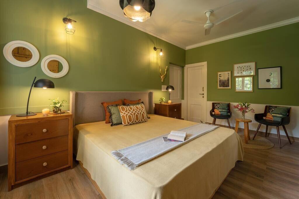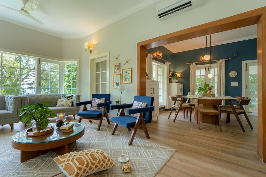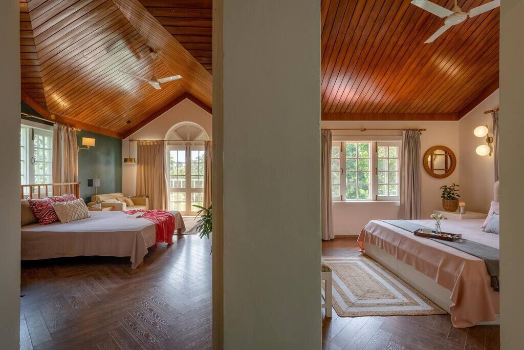 Exuding charm through soft hues, tasteful furniture, and thoughtfully curated interiors, Ivy Cottage is ideal for both intimate family holidays and celebratory reunions. This heritage villa is set against a backdrop of forested hills, with sprawling lawns, panoramic windows, and multiple outdoor sit-outs that draw in the lush landscape and mountain views.