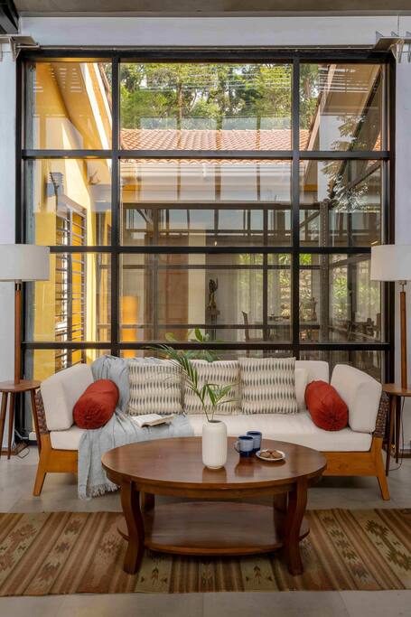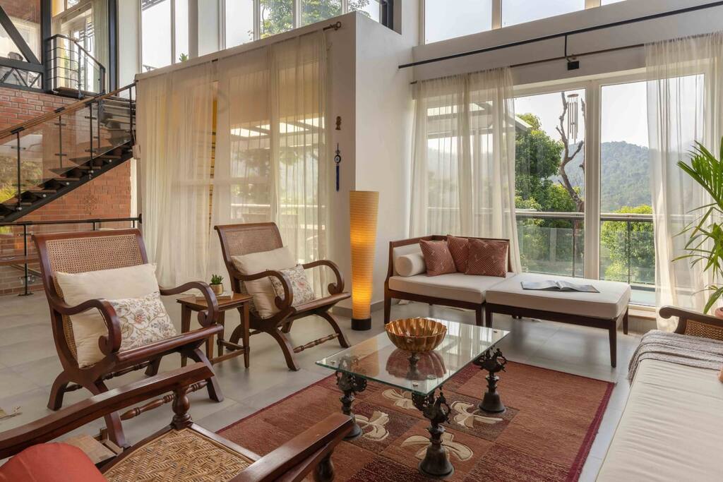 Whispering Waters is an architectural gem that offers more than just a stay—it’s an immersive Coorg experience. The villa reflects the heritage of the region through its colonial teak furniture, red-tiled roofs, and cane accents, while floor-to-ceiling glass windows flood the interiors with light and forest views. Whether you’re lounging on the patio, dining on the open deck, or walking through the plantation, the villa invites you to reconnect with nature in refined comfort.