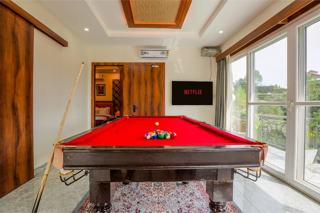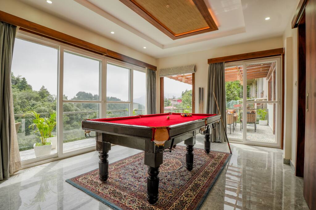 • Spacious lounge with pool table, comfortable seating, and a balcony overlooking the mountains.