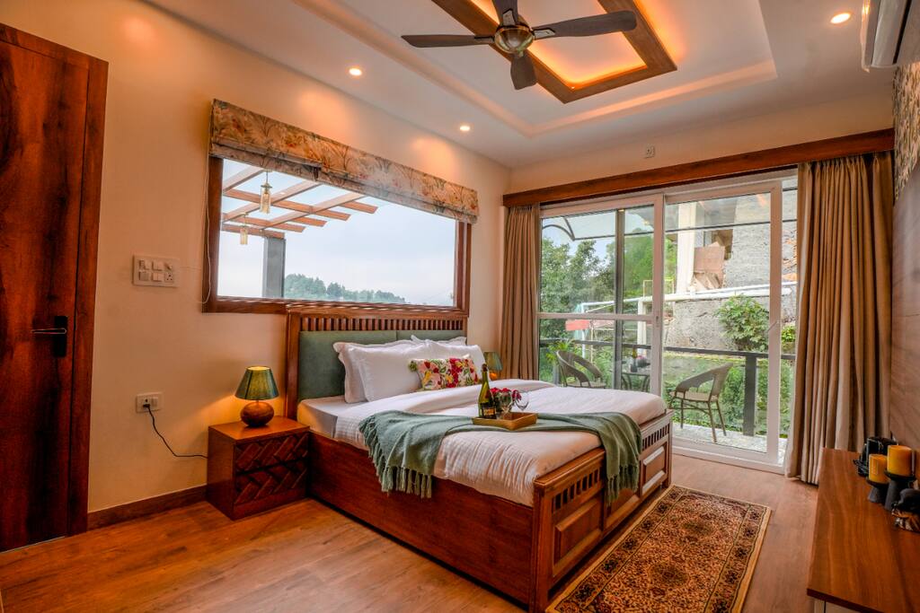 Balcony Bedroom with Mountain & Forest Views 🏞️The highlight of the villa! A beautifully styled bedroom that opens up to a private balcony with sweeping views of the mountains and dense forest.