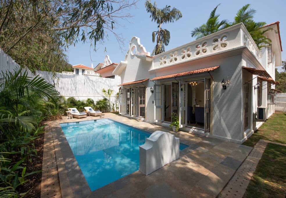 The villa's architectural design draws inspiration from the colonial legacy of Goa, reflecting the influence of Portuguese aesthetics that have shaped the region. The exterior facade showcases a seamless blend of vibrant hues and pastel shades, highlighting the region's tropical charm. The villa boasts graceful arches, intricately carved balconies, and large french doors and windows, all of which are characteristic of Goan Portuguese architecture.